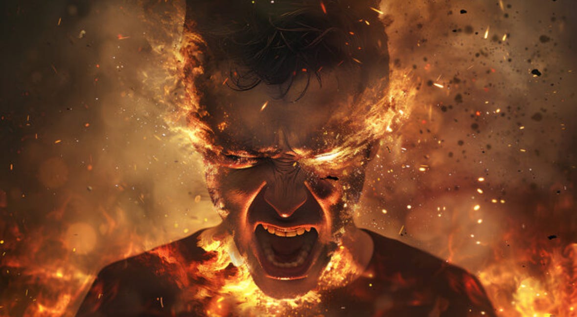 His fury is palpable, and adds 10 years to his appearance.